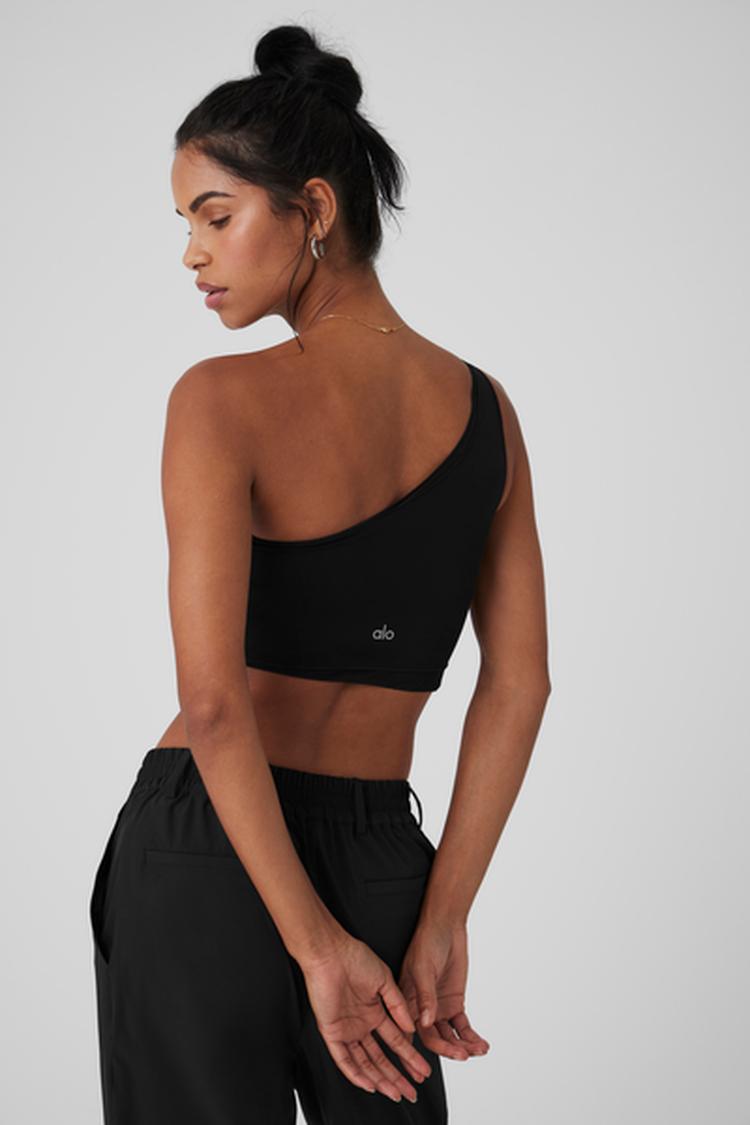 Fit: True to size—designed for a cropped fit with a one-shoulder silhouette
